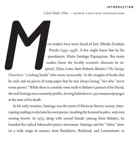 Best known as the inspiration for the irascible Ulises Lima in Roberto Bolaño’s famed novel The Savage Detectives, Santiago Papasquiaro is a formidable poet in his own right. His lyricism borders on the profane, with its bawdy metaphors and extensive use of vernacular imagery, often favoring an “ugly,” highly visceral beauty over the prim imagery found in more formal work.