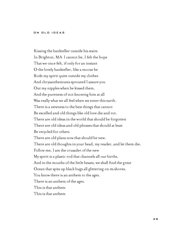 The heady, ascentionist quality of the poems, their sheer passion, don’t just bounce off into a poemy haze, or create the careful discursive acts so prevalent today. There are actual visions. You know, visions: overpowering, otherwordly warnings full of blood stains and blessings and blinding light.