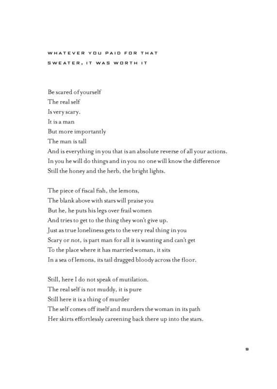 With an odd blend of brutality and delicacy, Dorothea Lasky constructs an entire individual psychology in 70 short pages. The tone is ingenue, direct, at times percussively flat. And it is completely engaged. There is seemingly no distance between speaker and speech, writer and word. It’s a complete investment that demands the same of the reader, and rewards it with vivid glimpses of the workings of a different mind, for the “I” here, quite refreshingly, makes no claim to universality. Instead, it flaunts its idiosyncrasies, and it is, after all, idiosyncrasies that are interesting... All in all, this poetry is extremely engaging--it’s fast, determined, and generous; it is not emotion recollected in tranquility, but emotion still in the grip of its own feeling, and believing in itself.