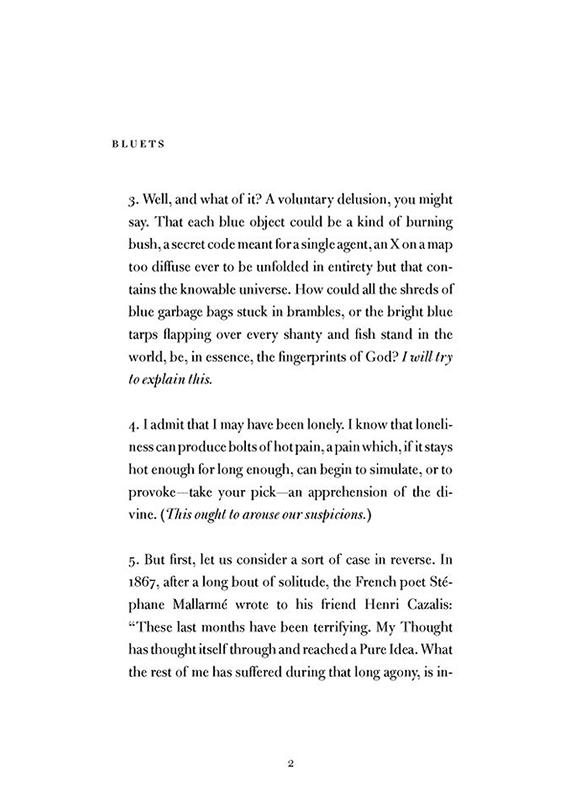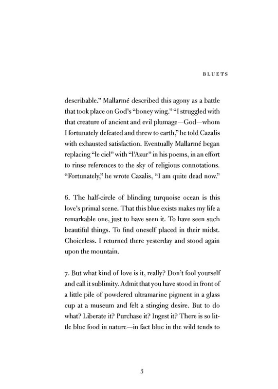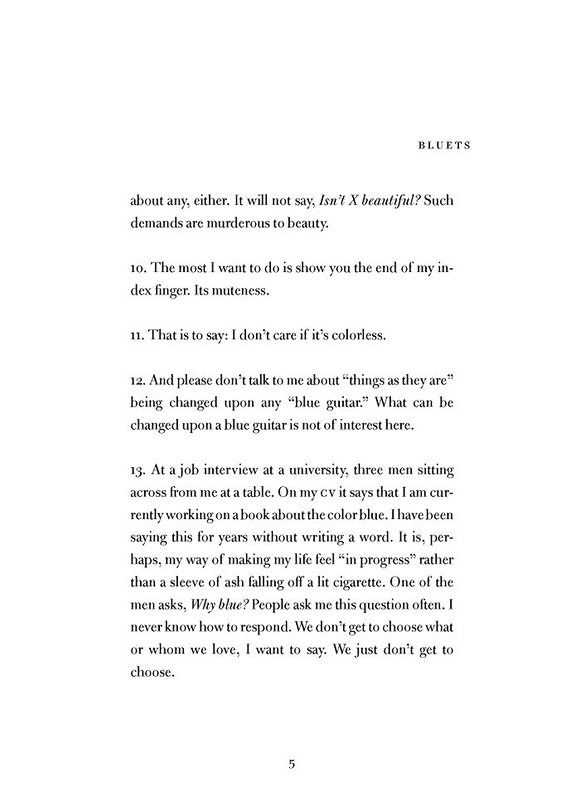 In the 240 prose entries the book consists of, Nelson deals with the personal loss of a relationship and witnesses the physical suffering of a friend who became a quadriplegic following an accident (something Nelson also wrote about in her 2007 poetry collection, Something Bright, Then Holes), all while returning again and again to the color blue.