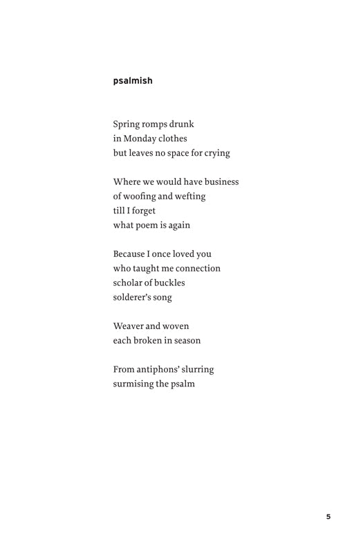 “A star arriving firmly / at the center of its cluster” is Rodney Koeneke’s Body & Glass. There is something very singing and also staid about these poems. I mean they have both a freshness and the mark of an experienced hand behind them. I hesitate to call it a “maturity” because it has a jouissance I don’t associate with that word. These poems continue to yield fruit on multiple readings: “furzed glebe” . . . “prefer your lineaments / to any rotting / thing this world adores.” They feel nutritious to me somehow, nutrient-dense, coming out of great care, great grief, great toil (for all their sprezzatura): “antiphons’ slurring / surmising the psalm.”