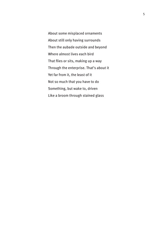 O’Brien’s greatest achievement is that he never fetishizes himself or panders to his audience, a rarity these days in poetry. Although his poems are resolutely abstract and he seems to find no pleasure in the surface of objects nor has an urge to burden us with autobiographical data, there’s moments in his poetry when he does disclose his ordinary life (doing dishes or laundry or walking his dog and so forth) and the details, while utterly mundane, occur so rarely in his work that they elevate (rather than cheapen) our brief time here, unconsciously radiant and tragically doing things
