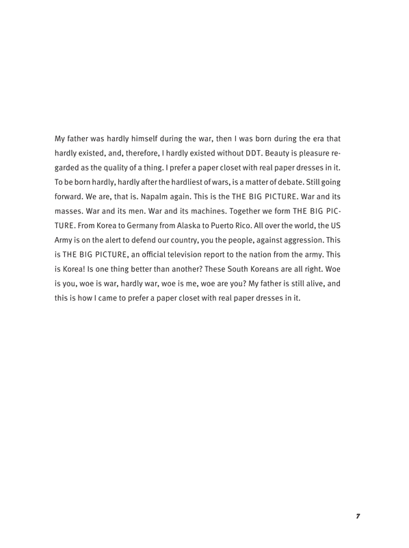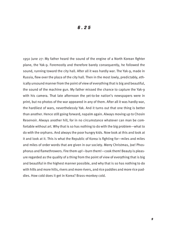 This book's sort of rogue clarity hinges on the poet's relationship with her father. Essentially, we experience the destabilizing effects of US-ROK entanglement as coherent because this relationship sutures time and space. His award-winning photographs of the war suffuse the pages.