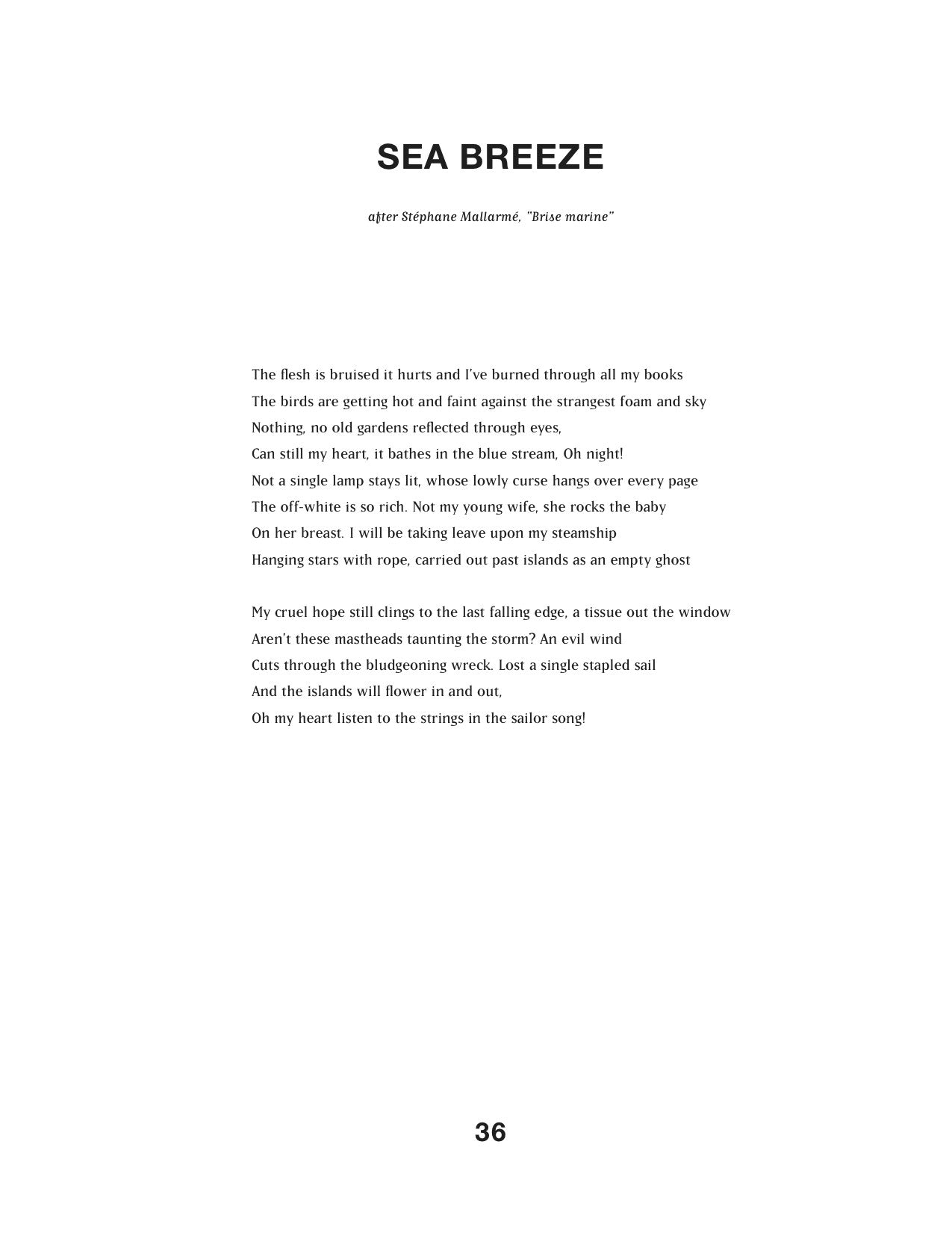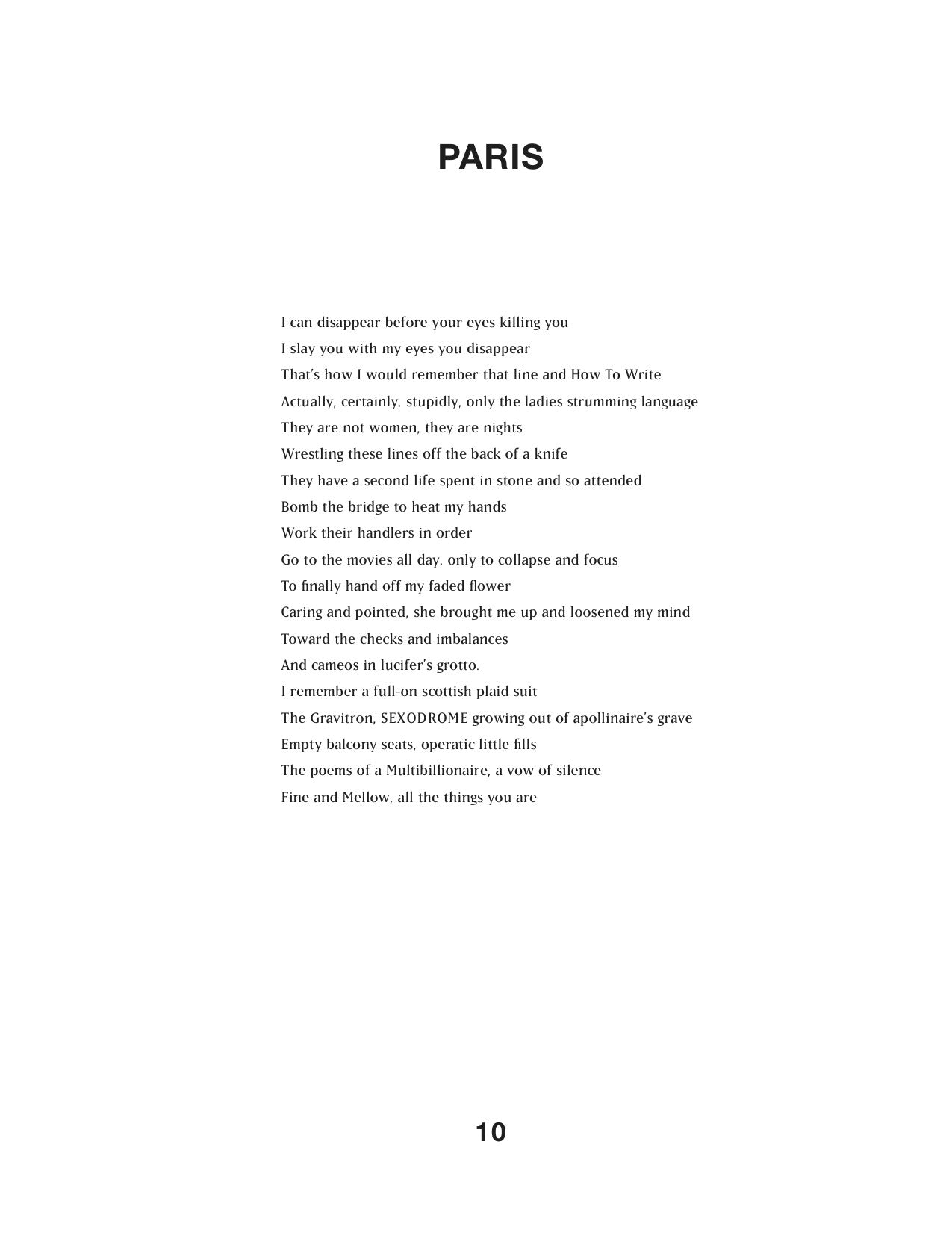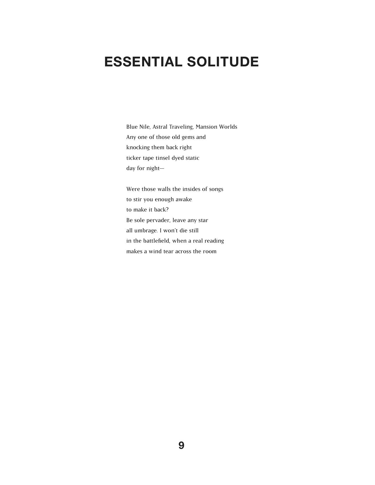 Sigo's own affectations and form are particularly notable in his ranging between choppy, across-the-page banter and flowing, long-lined lyrics. Sigo's drive to reassemble broken language into poems that ring of truth-in-experience earn him his most arresting moments.