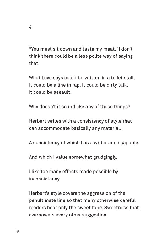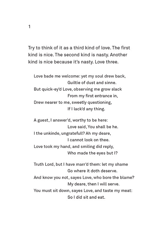 Love Three is a study of a seventeenth-century devotional poem by George Herbert; an essay on eroticizing power; and a memory palace of sexual experiences, fantasies, preferences, and limits—with Herbert’s poem as the key. It is unlike anything you have ever read—a deep, attentive reading of a text and a broad analysis (personal, historical, philosophical) of humanity’s most enduring theme.