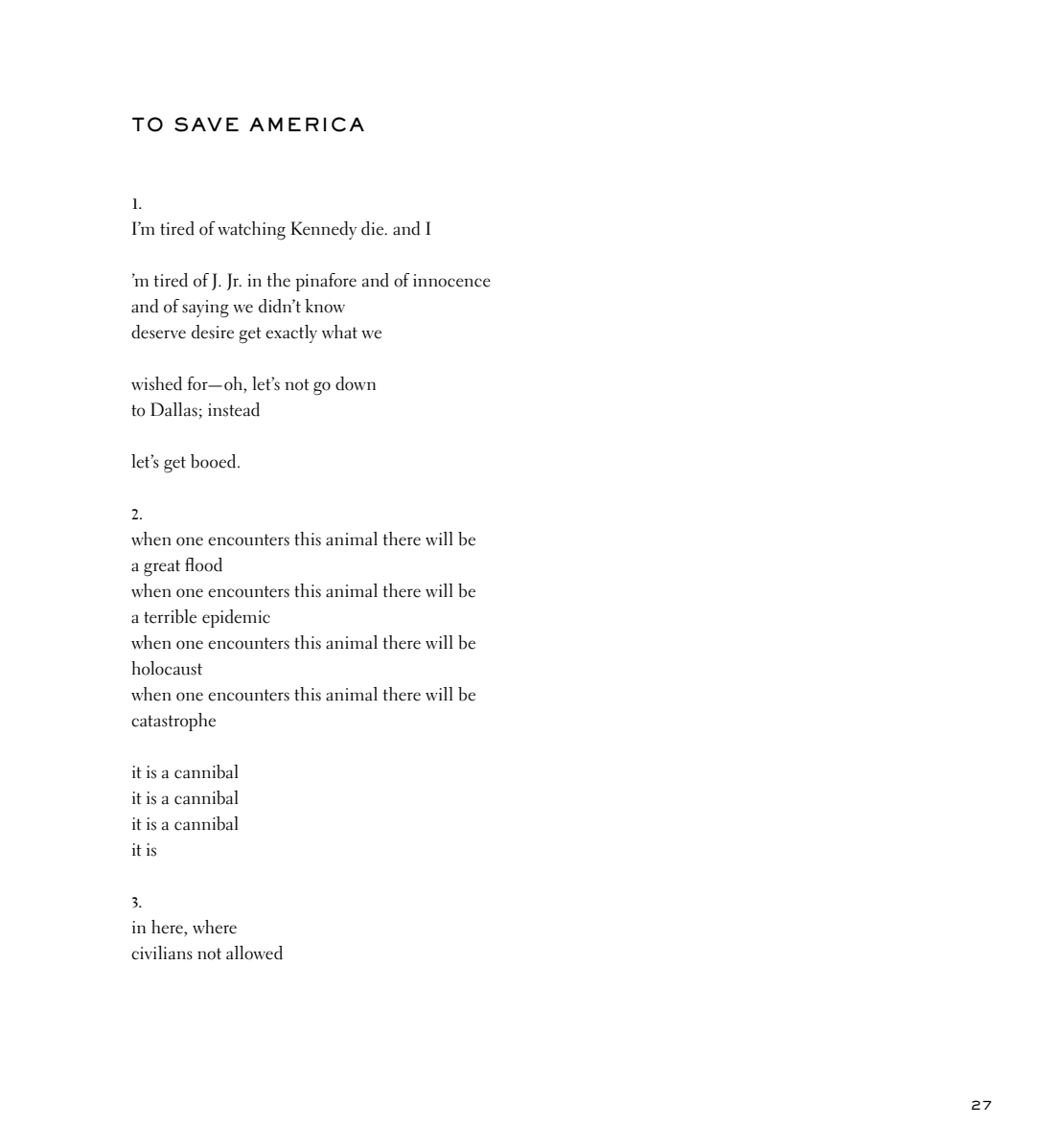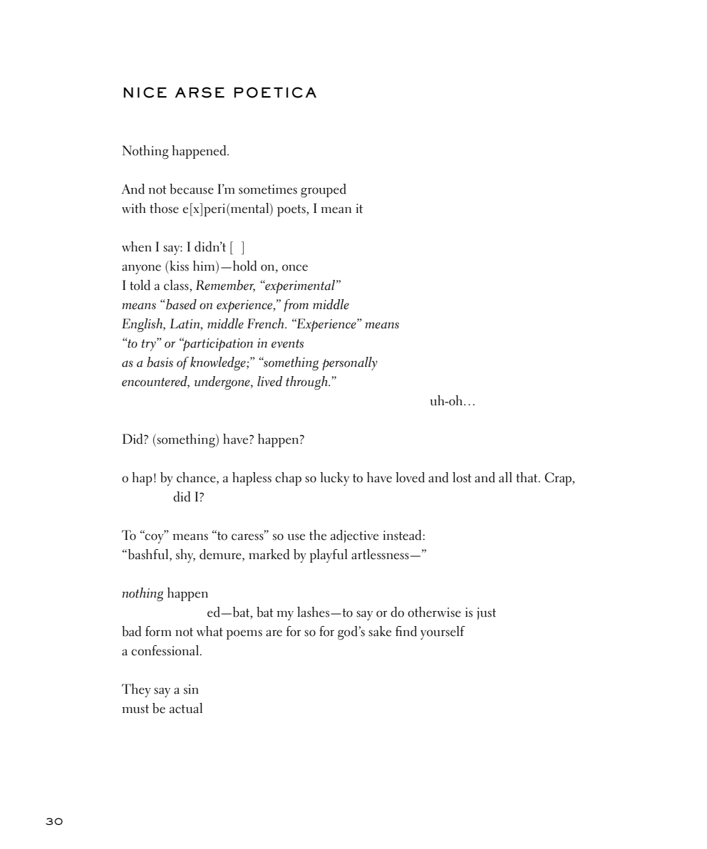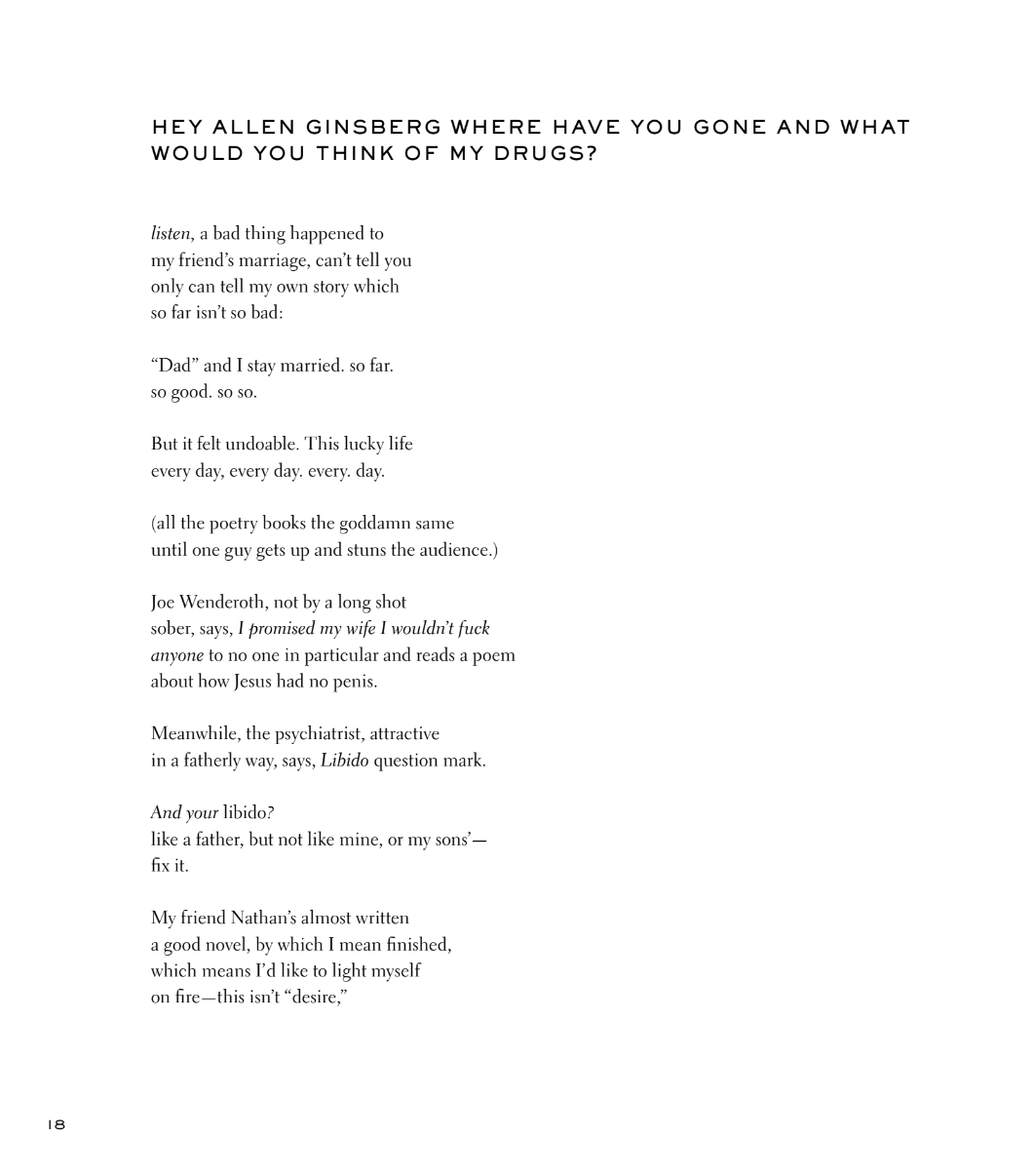 Don’t get me wrong—it isn’t simply a spinsters’ schadenfreude that draws me to this confessional book. I love how varied the poems are. Each one takes a different shape, ranging across the page in a way that would make Robert Duncan proud.