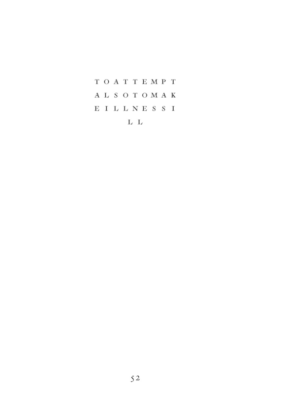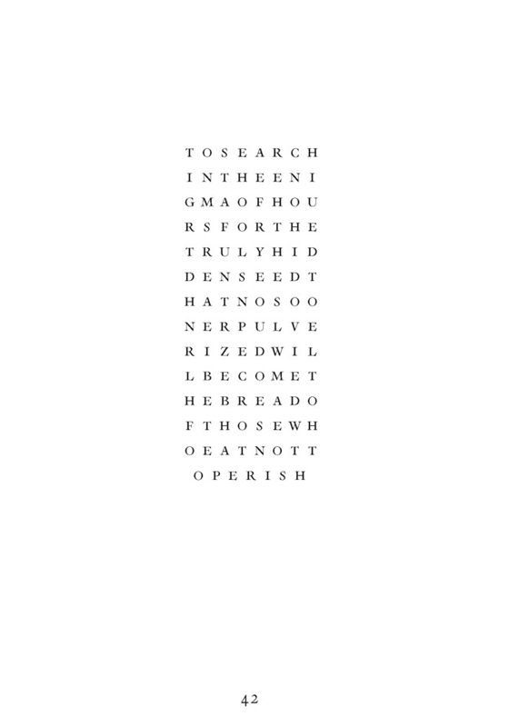 These brief geometrical wonders pack a big punch as puzzles that become poems. Like tiny poetic word searches, these small poems reveal themselves as tightly-packed aphorisms, asserting themselves physically in the world with a wisdom that is somehow simultaneously novel and ancient.