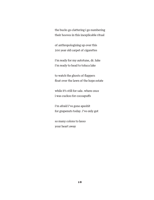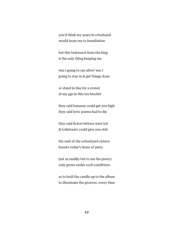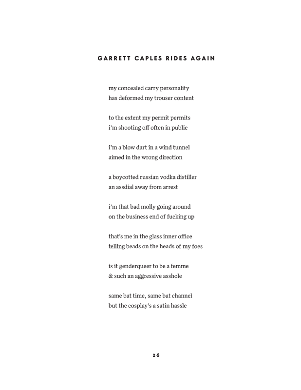 A power ballad was a hair metal band's voyage into the softer side of rock, compromising to the integrity of the genre, but genuine and trailblazing. So too is Caples' Power Ballads. His poems and prose pieces are bizarre and hilarious, in which Dylan and Bowie sit alongside the French surrealists, with the occasional turn into heartfelt romanticism.