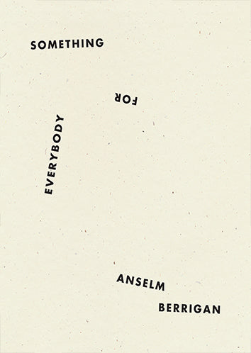 Anselm Berrigan’s eighth collection of poems, Something for Everybody, is exactly as its title describes. Wide-ranging in forms, densities, and aesthetics—and written from numerous collaborations, prompts, and influences—these poems express poetry’s astonishing possibilities. At the same time, they evince this singular poet’s consciousness in the here and now, as a family and community member looking at the seams of public life.