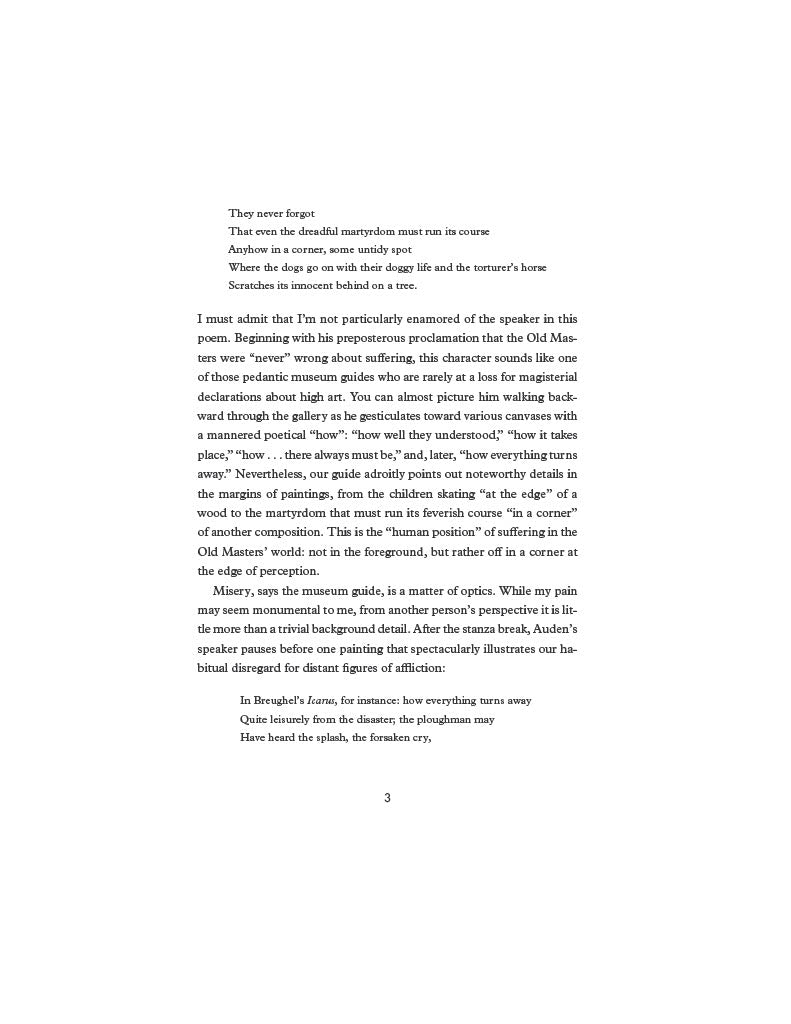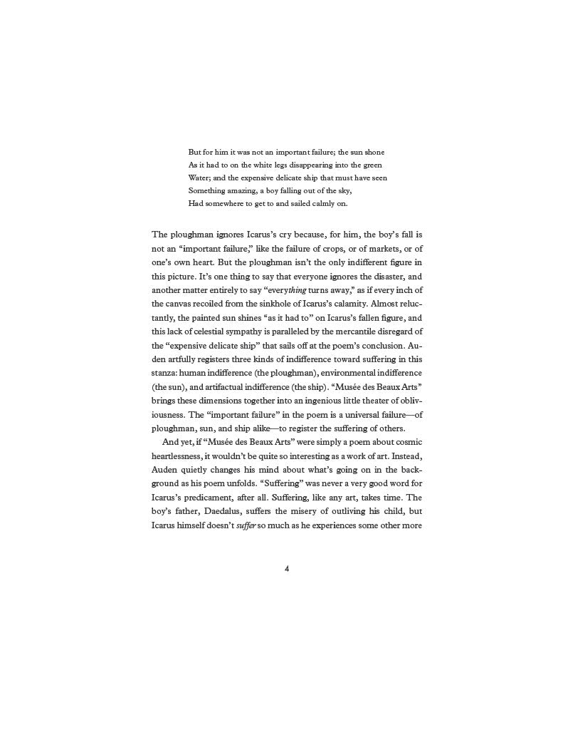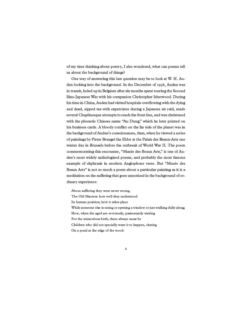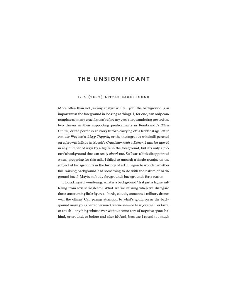 True to its title, The Unsignificant is concerned with what it’s not about—not significance, or insignificance, but “unsignificance.” The lectures approach poetry from Homer to Gertrude Stein to Ronald Johnson obliquely, refracted through images such as Bruegel’s Landscape with the Fall of Icarus, Hermann Rorschach’s inkblots, or Galileo’s drawings of the moon. Ranging from pictorial backgrounds in visual art to portraiture and similes to the poetics of wonder, The Unsignificant embarks on an errant tour of Western poetry and poetics from the ancient world to our continuous present.