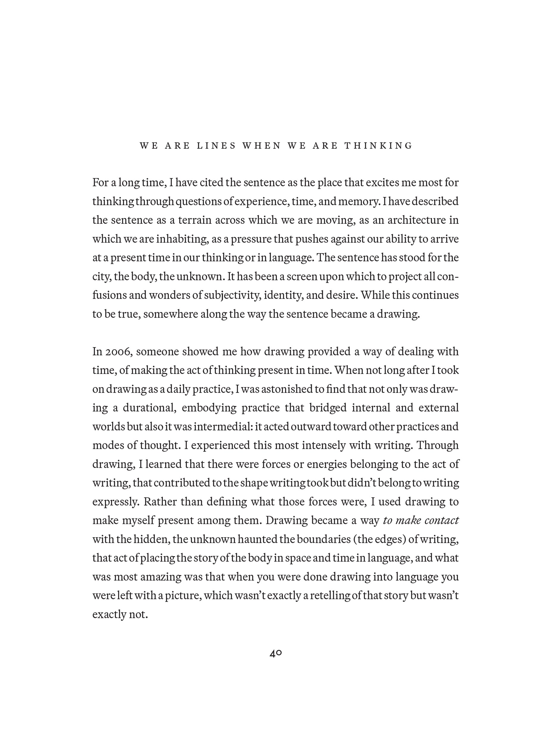 This attention to the movement and moment of the line distinguishes her work from those other experiments with drawn poems, such as Robert Grenier’s drawing poems or Cy Twombly’s calligraphic paintings, that we might reach to for comparison....It’s as if she’s discovered the place where the living line and the line of language converge after a temporary separation.