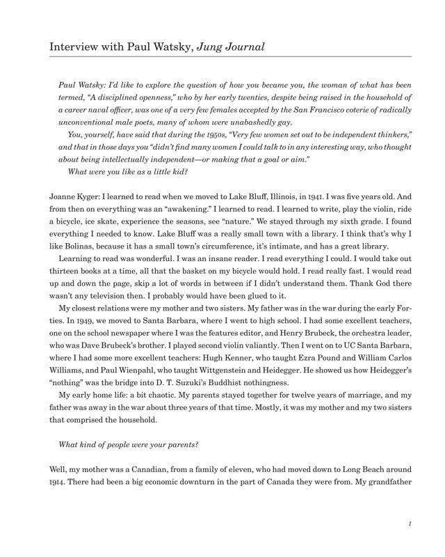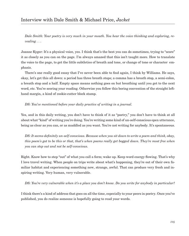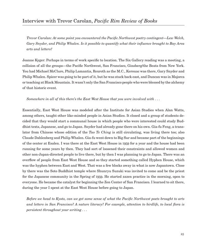 This collection offers a revealing addition towards comprehending the wide range of influences and enchantments informing Kyger's practice as a poet... The several interviews collected in this volume capture Kyger at different moments along the path of her lifetime, providing, overall, an account of an existence lived intentionally, simply, thoughtfully and non-materialistically; an existence especially attuned to local ecology, and attention to, and deep appreciation for, a poetic articulation of the daily commonplace.