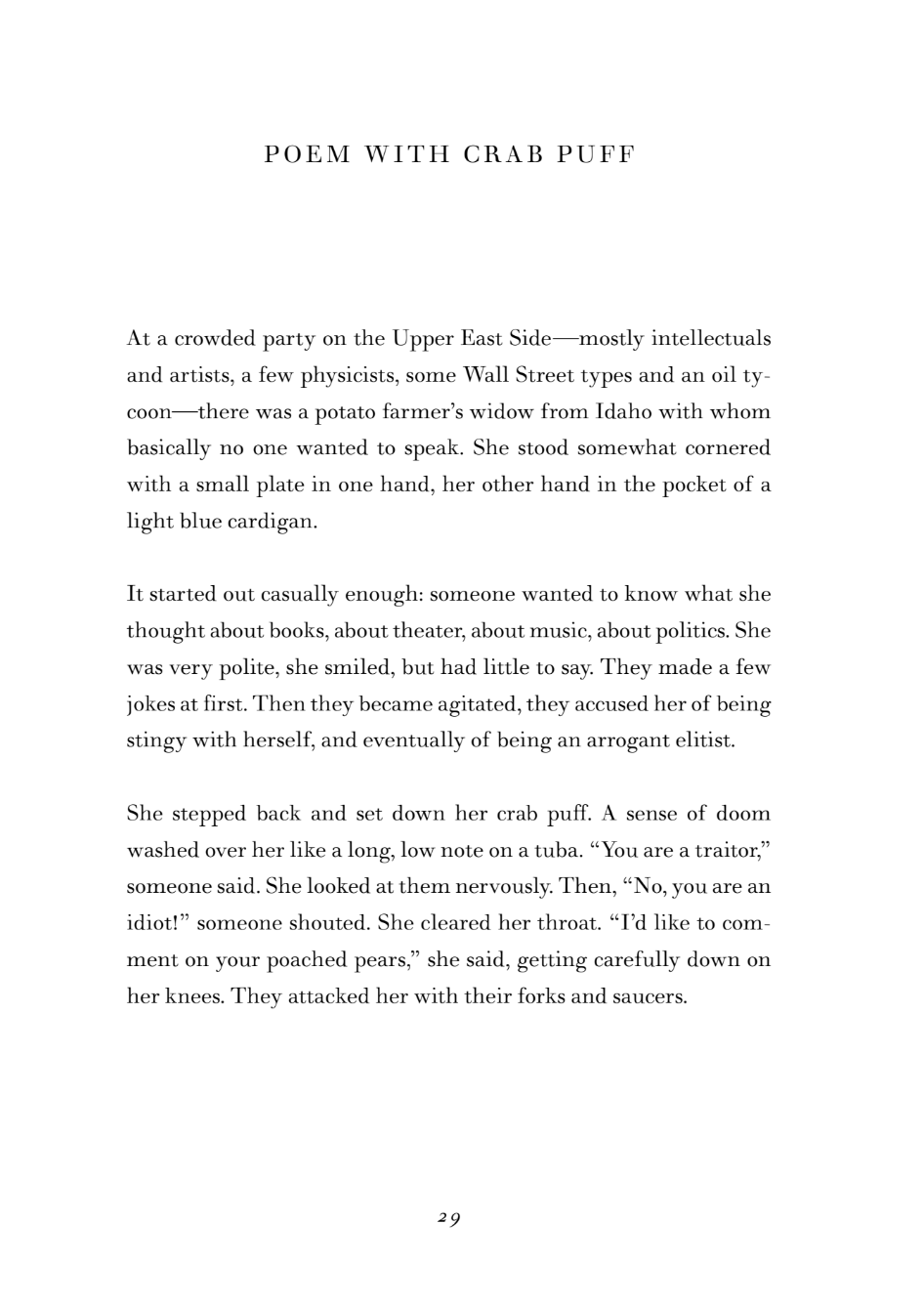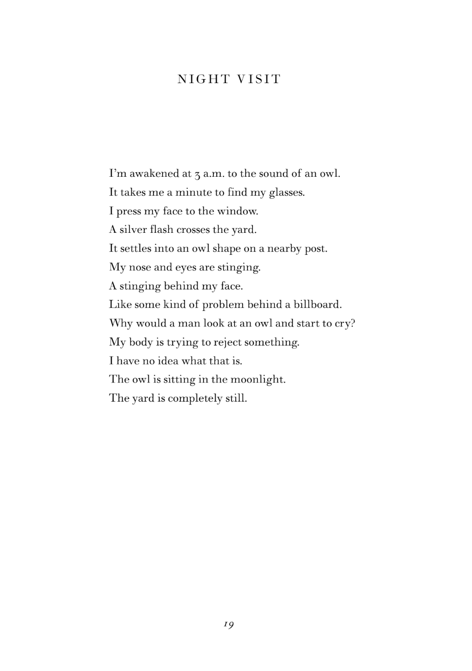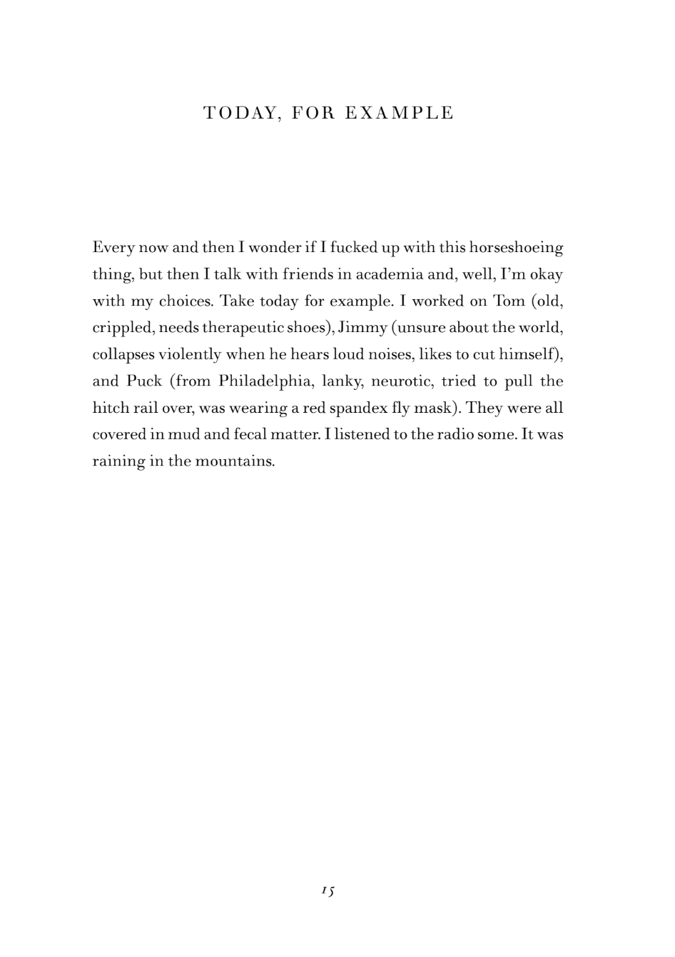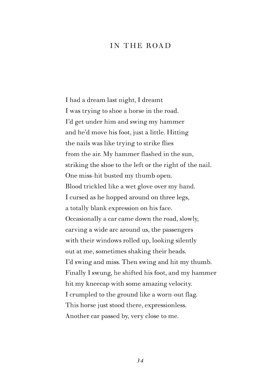 It may be unfair to drag biography onto the stage, but Michael Earl Craig lives in Montana and shoes horses for a living, and these frequently seem like poems that might be spoken by someone who lives in Montana and shoes horses for a living. They are precise, cool, metallic poems, laconic and wry. They are the poems of observation and spun-off thought that might easily arise from solitary work. The language is plain, unflowery; it’s the disjointed logic of the images that turns the lines into spare poetry.