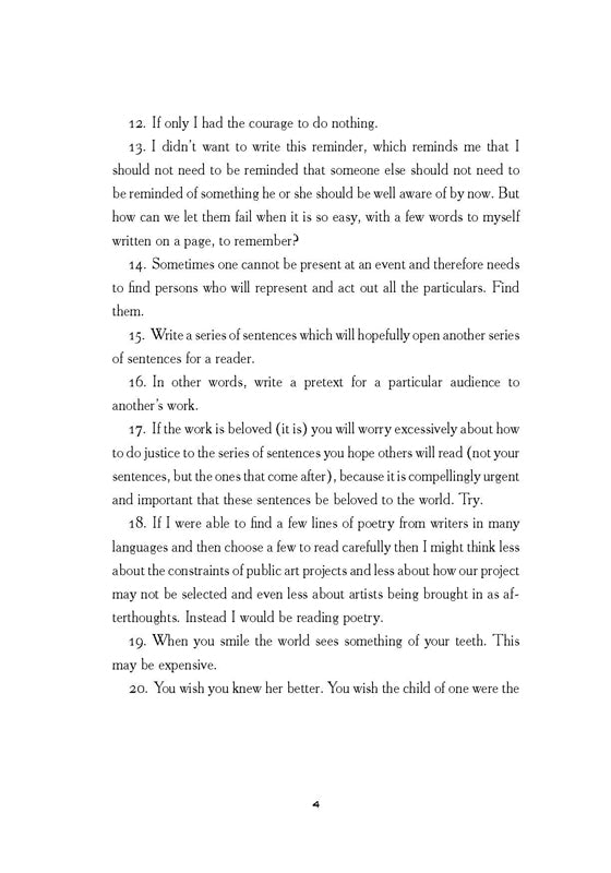 It’s everybody’s biography, always “not yet begun," as well as the list of directions, questions, and observations for provoking an investigation into the interior of a life keenly attentive to the resonance of other lives. The reader recognizes herself as the I, the you, the character in a novel, someone missing, someone alive again— illuminated, self-conscious, caught in the act. Like CD Wright, whose work inspires the title, Laynie Browne is hilarious at a slant, provocative, and touching. Her language, which makes everything happen, has an incomparably swervy brilliance.