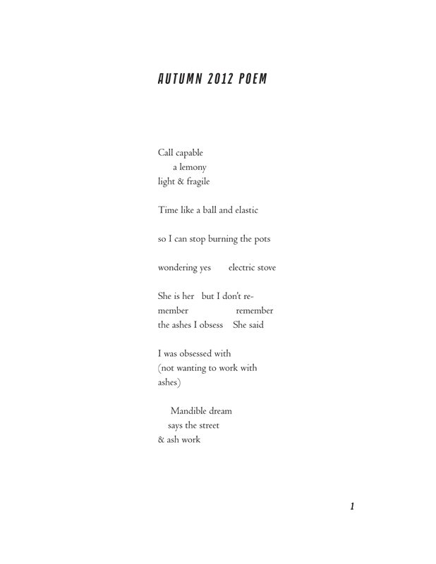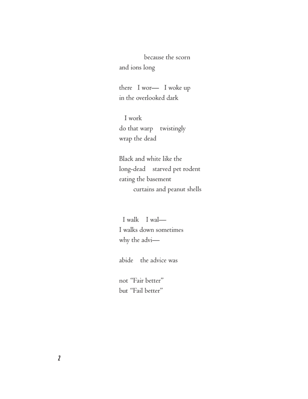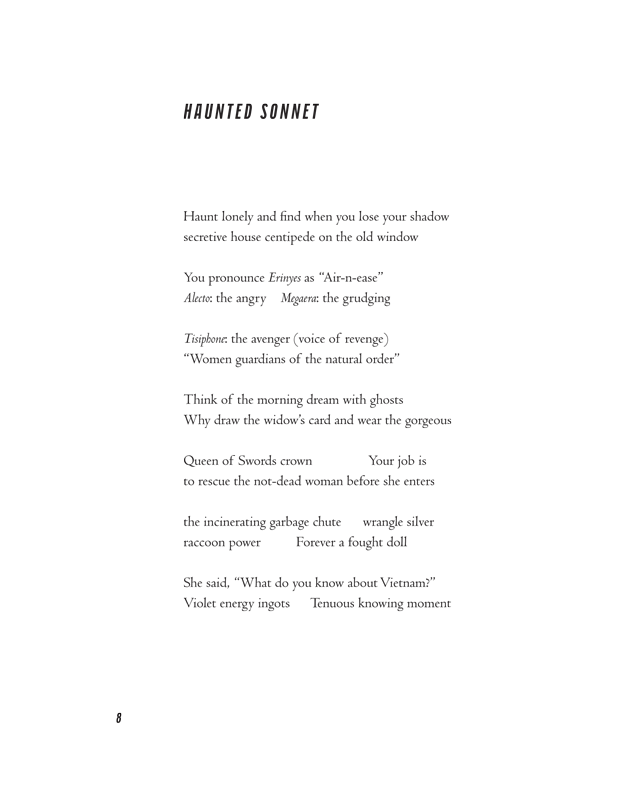 Boston ReviewThe poems themselves are violet energy ingots, a series of tenuous knowing moments that eschew the monumental gestures of narrative, polemic, or other familiar forms our cultures have made to mark modernity’s abuses of power. Monumental gestures that give us something to say when asked for an account. Instead, the poems take up the work of showing the way that the very fabric of the daily, of language, and of our selves are marked by historical trauma.